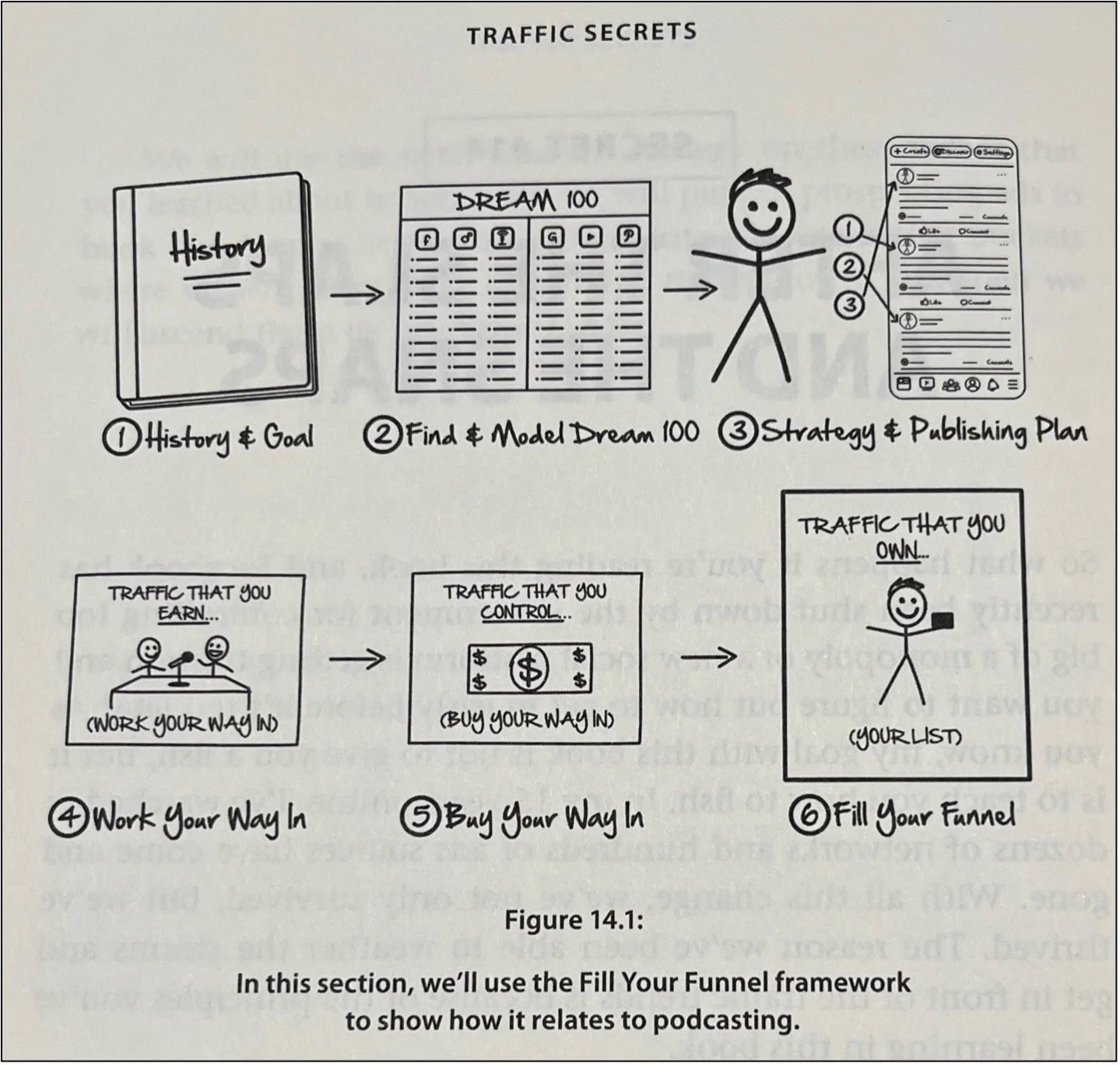 I just wrapped up the sixth section of the book in Traffic Secrets: The Underground Playbook for Filling Your Websites and Funnels with Your Dream Customers by Russell Brunson entitled “Fill Your Funnel.” Brunson’s book outline is pictured in the infographic below and presents a model for what you need to do to achieve success in any business endeavor.